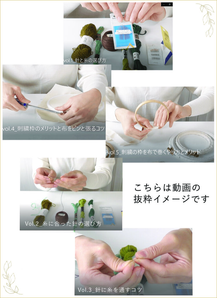 刺繍初心者はもちろん、経験者にも役立つ刺繍の豆知識を、分かりやすい5本の動画レッスンにぎゅっとまとめました。